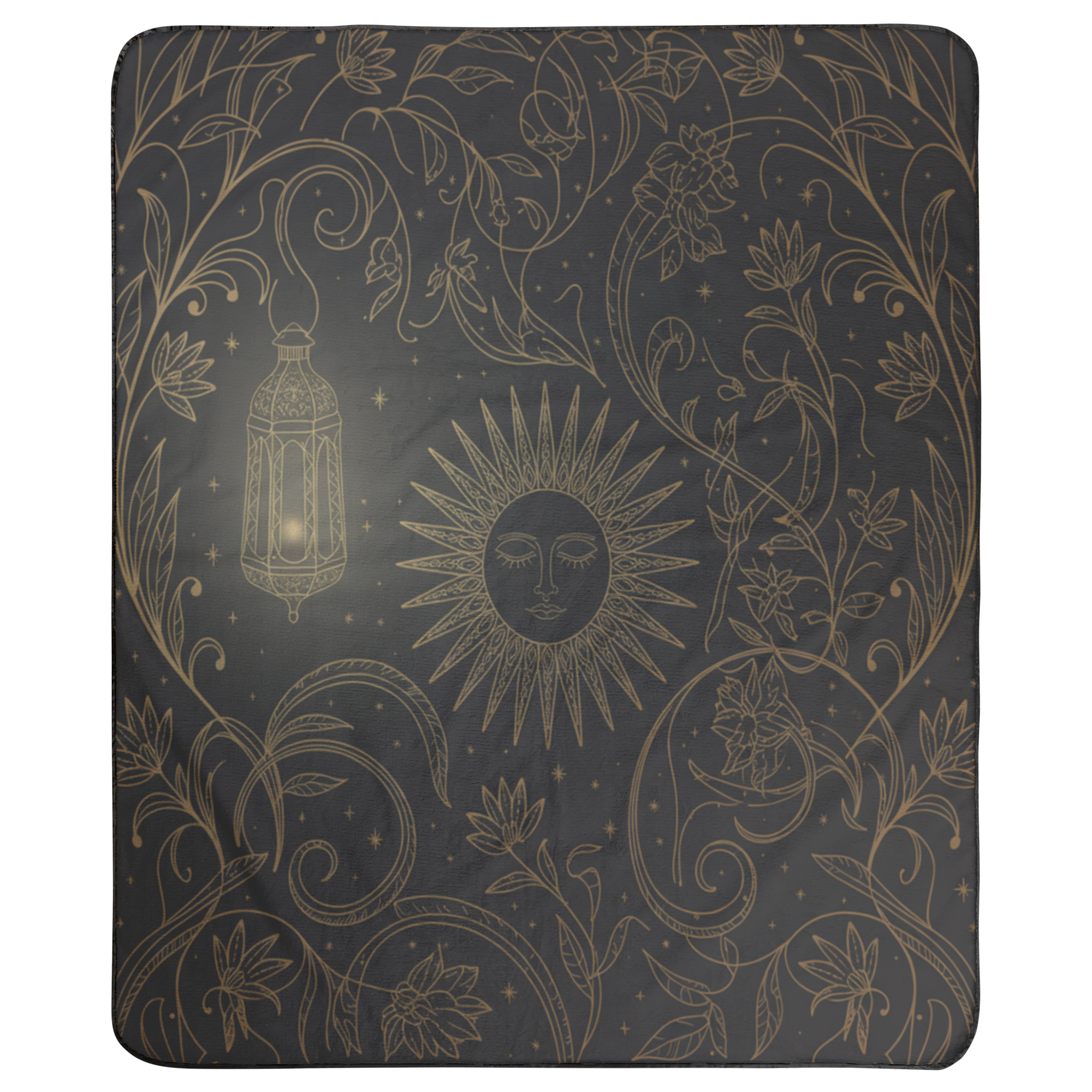 Wrap yourself in warmth and wonder with our beautifully designed stadium blanket, crafted to feel like a soft embrace. Featuring delicate gold-toned linework of curling vines encircling a radiant sun and softly glowing lantern, this enchanting design captures the quiet elegance of light blooming in the darkness. Made with super-soft fleece for cozy comfort and a tough, water-resistant bottom perfect for bleachers, picnics, and all your outdoor adventures, this blanket is your ultimate sidekick. It rolls up neatly with a handy carrying handle—no more blanket wrestling! Whether you’re curling up for a quiet evening or adding a touch of golden charm to your home, this blanket is a cozy celebration of light, nature, and style wherever you go.