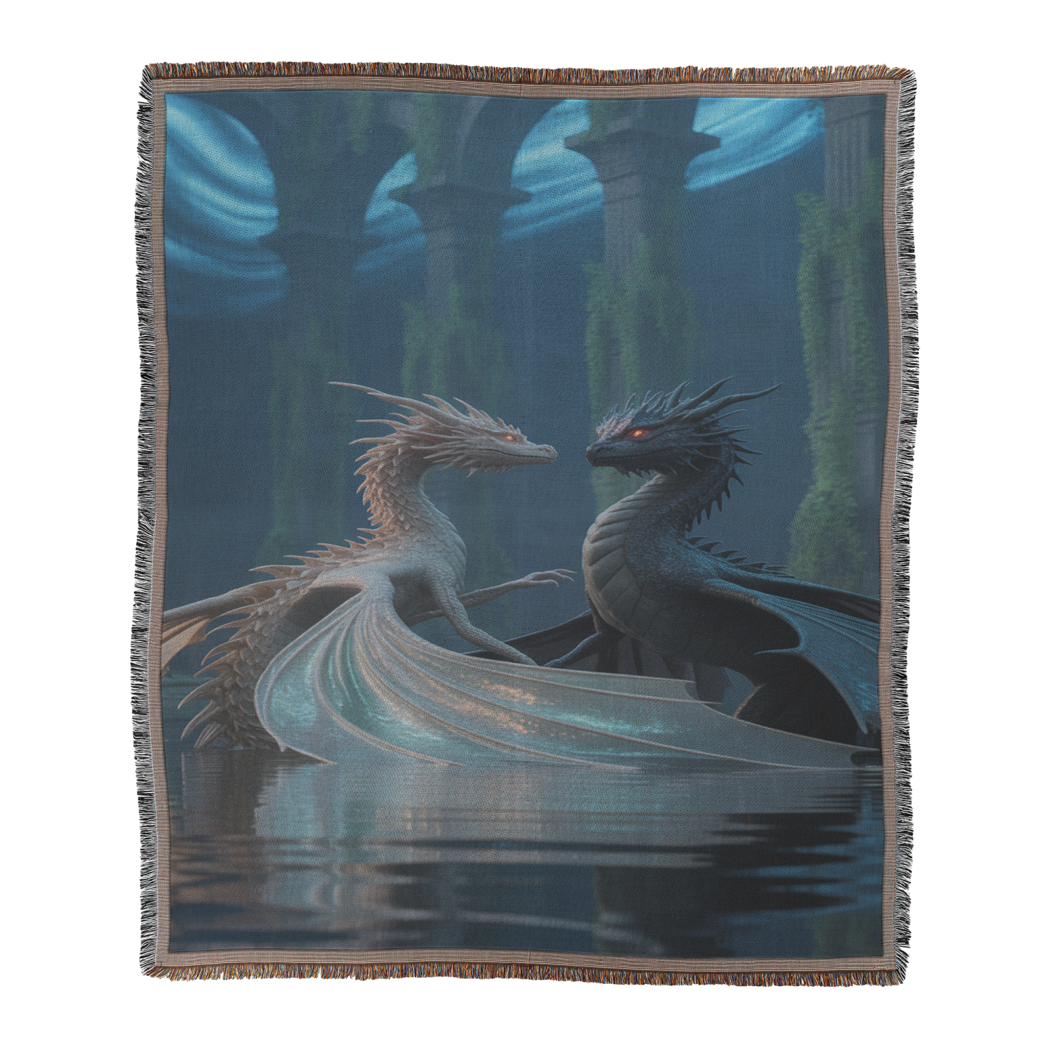 Prepare to be swept away by the tranquil charm of our beautifully woven throw blanket, featuring two graceful dragons playfully gliding through a serene, moonlit pool of water. This enchanting scene captures the gentle side of mythical majesty, bringing a sense of peace, wonder, and whimsy to your space. Expertly crafted from a premium blend of cotton and polyester yarns, this cozy companion offers lasting durability and an irresistibly soft touch. With its playful fringed trim and artistic design, this throw is as stylish as it is snuggle-worthy. Whether you’re curling up for a quiet night in or adding a splash of personality to your décor, this blanket is perfect for anyone who believes comfort and a bit of magic should always go hand in hand.