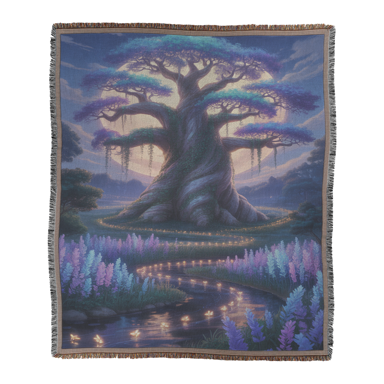 Prepare to be enchanted by the cozy magic of our whimsical woven throw blanket. Featuring a dreamy scene of fairies fluttering along a moonlit river, dancing toward their glowing home nestled in the branches of an ancient tree, this blanket brings storybook wonder to life. Expertly crafted from a soft yet durable blend of cotton and polyester yarns, it’s designed to wrap you in lasting comfort and luxurious texture. The delicate fringed edges add a playful touch, making it a charming accent for any room. Whether you’re curling up with a good book or adding a sprinkle of fantasy to your home, this throw is perfect for anyone who believes comfort should always come with a little bit of magic.