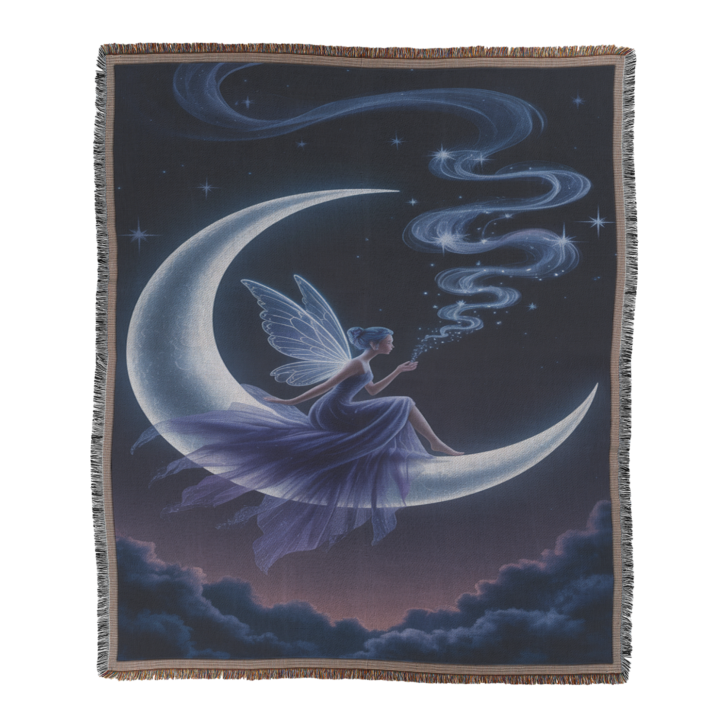Drift into a world of wonder with our enchanting woven throw blanket, featuring a delicate fairy perched on a glowing crescent moon, gently blowing a trail of sparkling fairy dust wishes into the universe. This magical scene brings a sense of calm, imagination, and celestial charm to any space. Woven from a perfect blend of cotton and polyester yarns, this cozy blanket is made to last while wrapping you in the softest, most luxurious embrace. With its playful fringed edges and dreamy design, it’s more than just functional—it’s a little piece of stardust for your home. Whether you’re settling in for a movie night or adding a whimsical touch to your favorite corner, this throw is the perfect companion for anyone who believes in comfort, magic, and the power of a wish.
