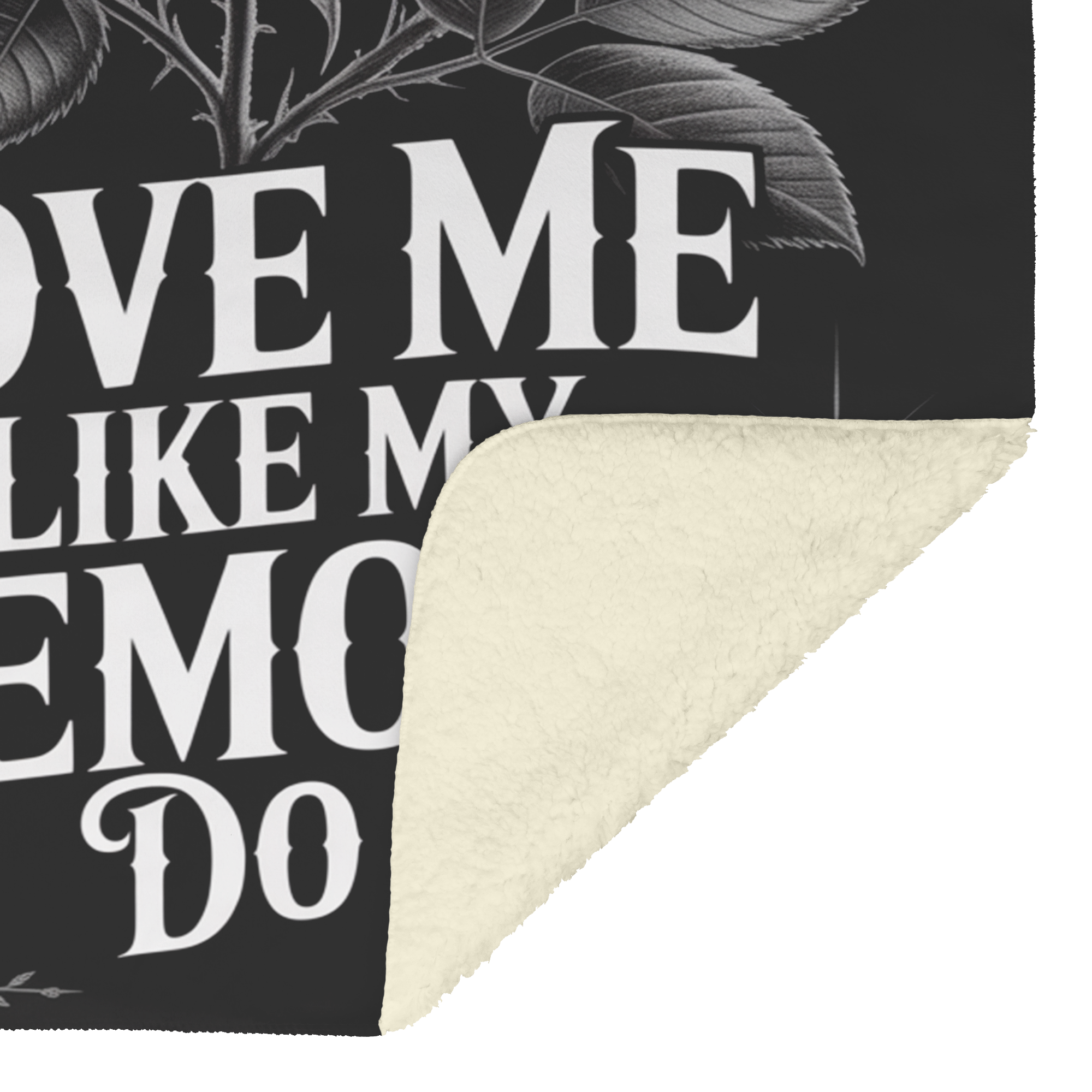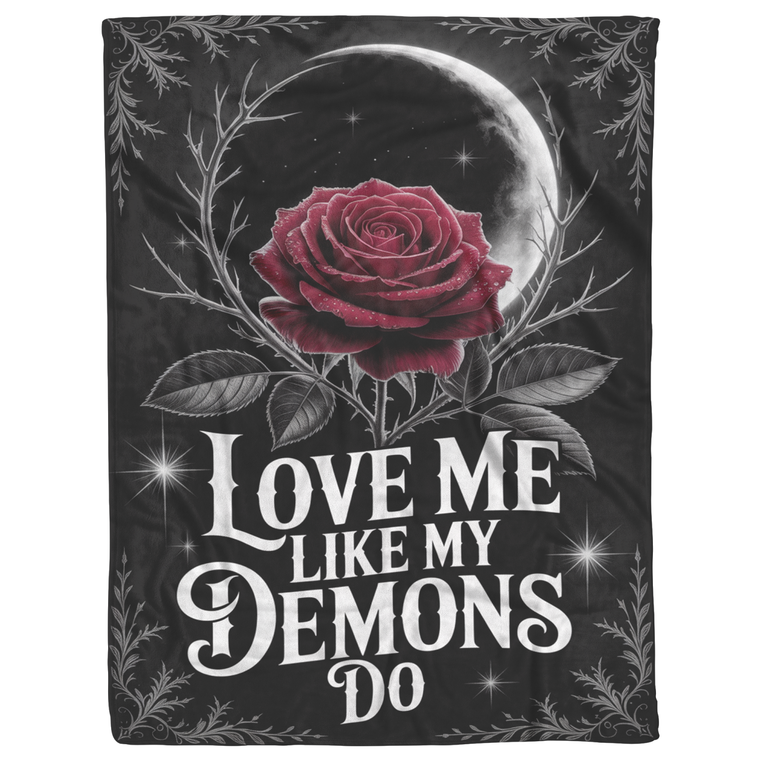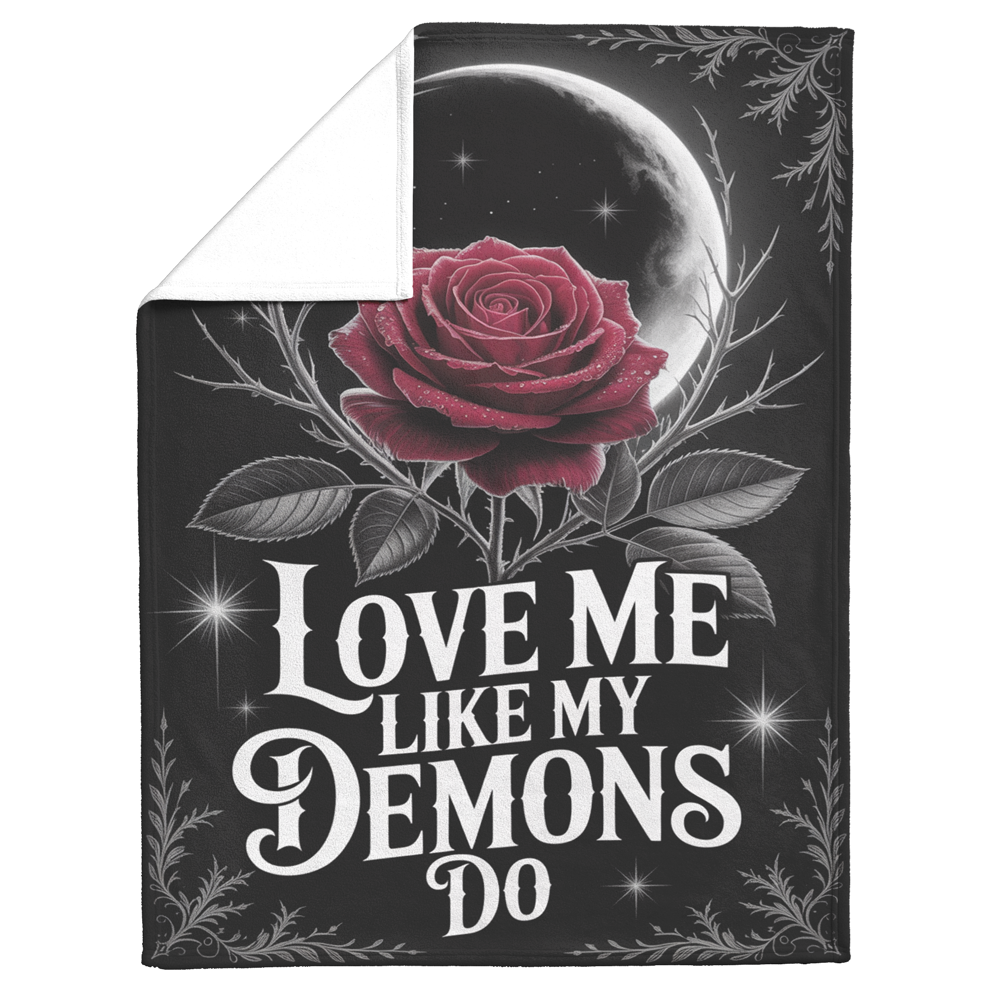 Fall under the spell of comfort and style with our hauntingly beautiful blanket. Featuring a striking gothic rose beneath a glowing moon and the evocative phrase “Love me like my demons do,” this piece blends dark romance with irresistible coziness. Crafted from a soft, durable blend of cotton and polyester, it offers a luxuriously smooth feel built to last. Whether you’re curling up for a moody movie night or adding a touch of poetic drama to your decor, this blanket is perfect for those who find beauty in the shadows and comfort in the unconventional. Available in two luxurious variations: a lightweight, pill-free microfiber fleece that’s supremely soft, warm, and cozy, and a sherpa-backed fleece designed to keep you warm on the coldest nights.