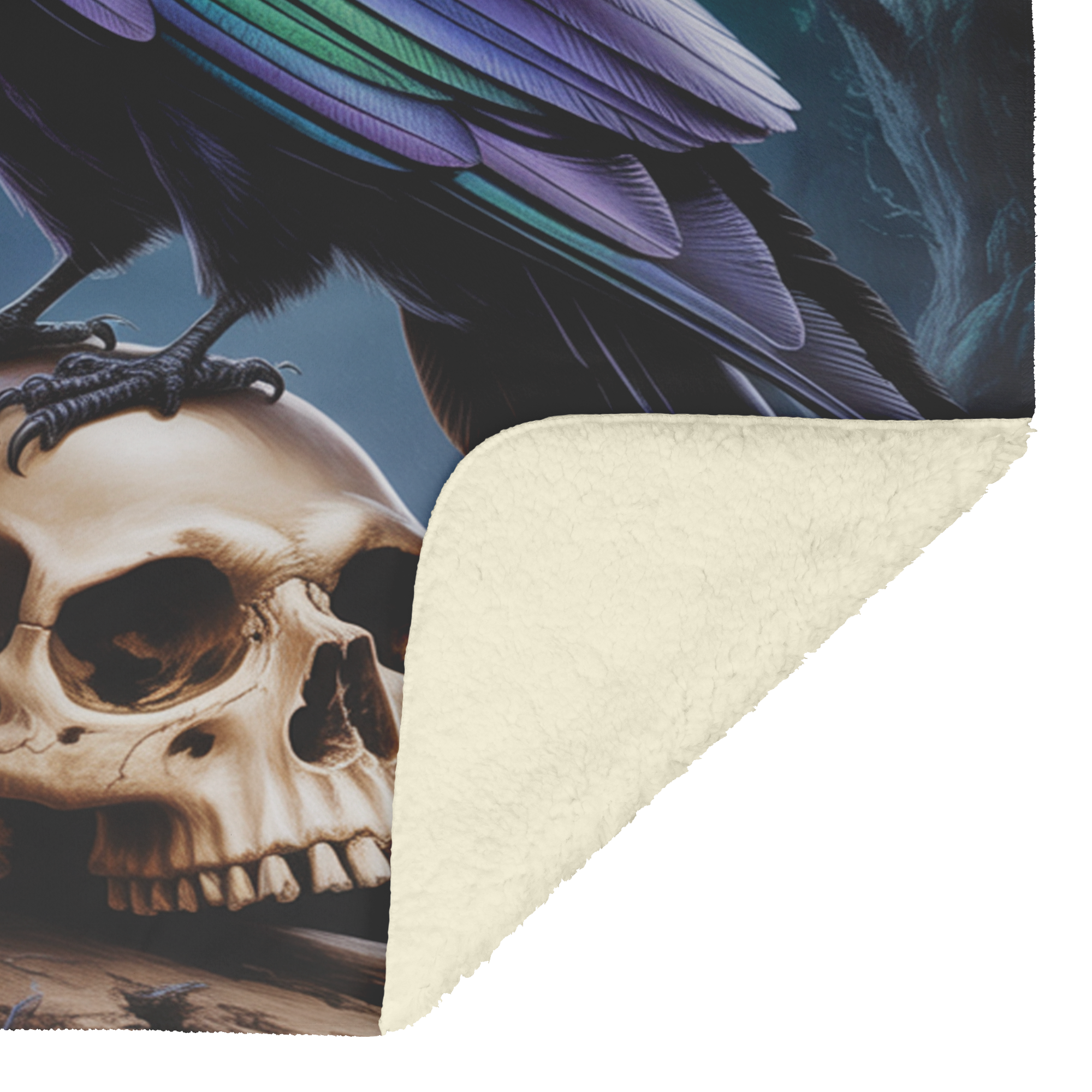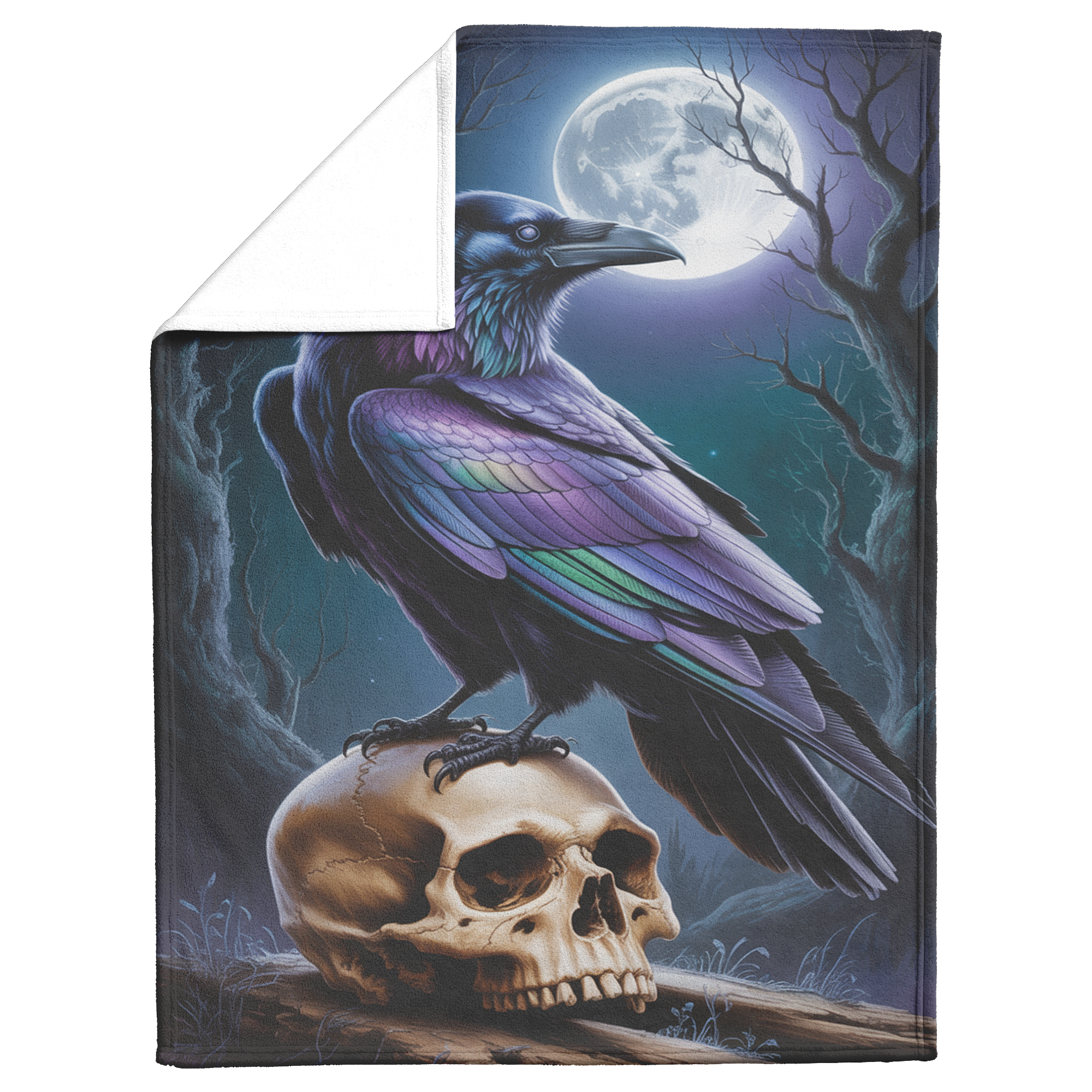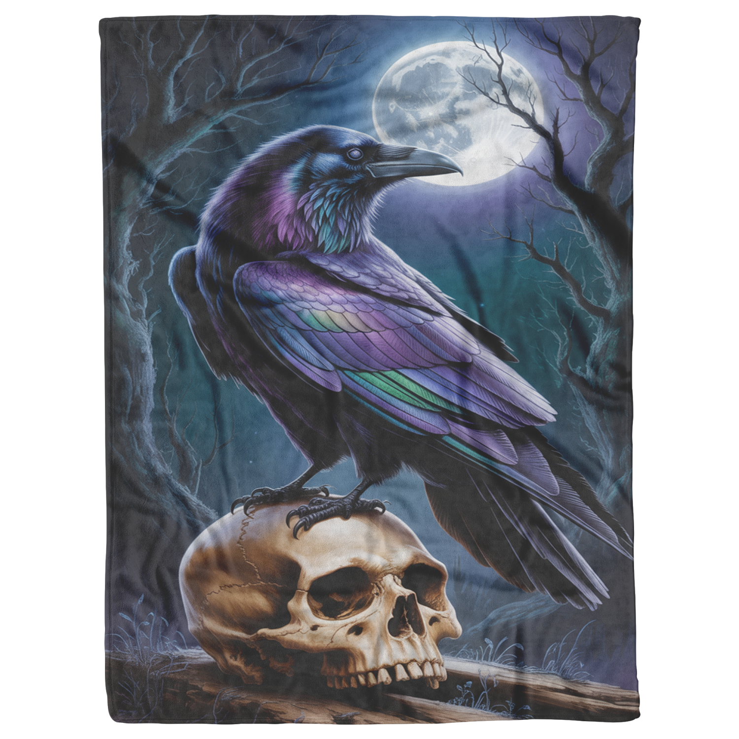 Wrap yourself in the haunting beauty of Moonlit Omen—a stunning blanket featuring a striking, ethereal raven perched atop a weathered human skull beneath a glowing full moon. Radiating iridescent shades of violet, indigo, and emerald, the raven’s feathers shimmer against a shadowy forest backdrop of twisted trees and midnight skies. This mystical scene brings gothic elegance and deep symbolism to your space, perfect for those who find beauty in the mysterious and the macabre. Whether draped over your couch or wrapped around your shoulders, this blanket is both a bold statement and a cozy retreat into the night. Available in two luxurious variations: a lightweight, pill-free microfiber fleece that’s supremely soft, warm, and cozy, and a sherpa-backed fleece designed to keep you warm on the coldest nights.