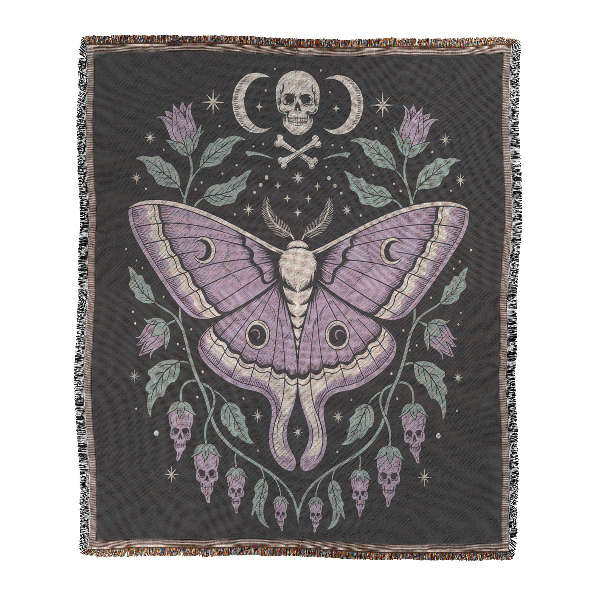 Prepare to be captivated by the haunting beauty of our gothic moth woven throw blanket—a perfect fusion of elegance, mystery, and comfort. At the heart of this striking design is a delicately detailed moth, surrounded by blooming skull-shaped flowers, creating a dreamlike balance between the macabre and the mesmerizing.