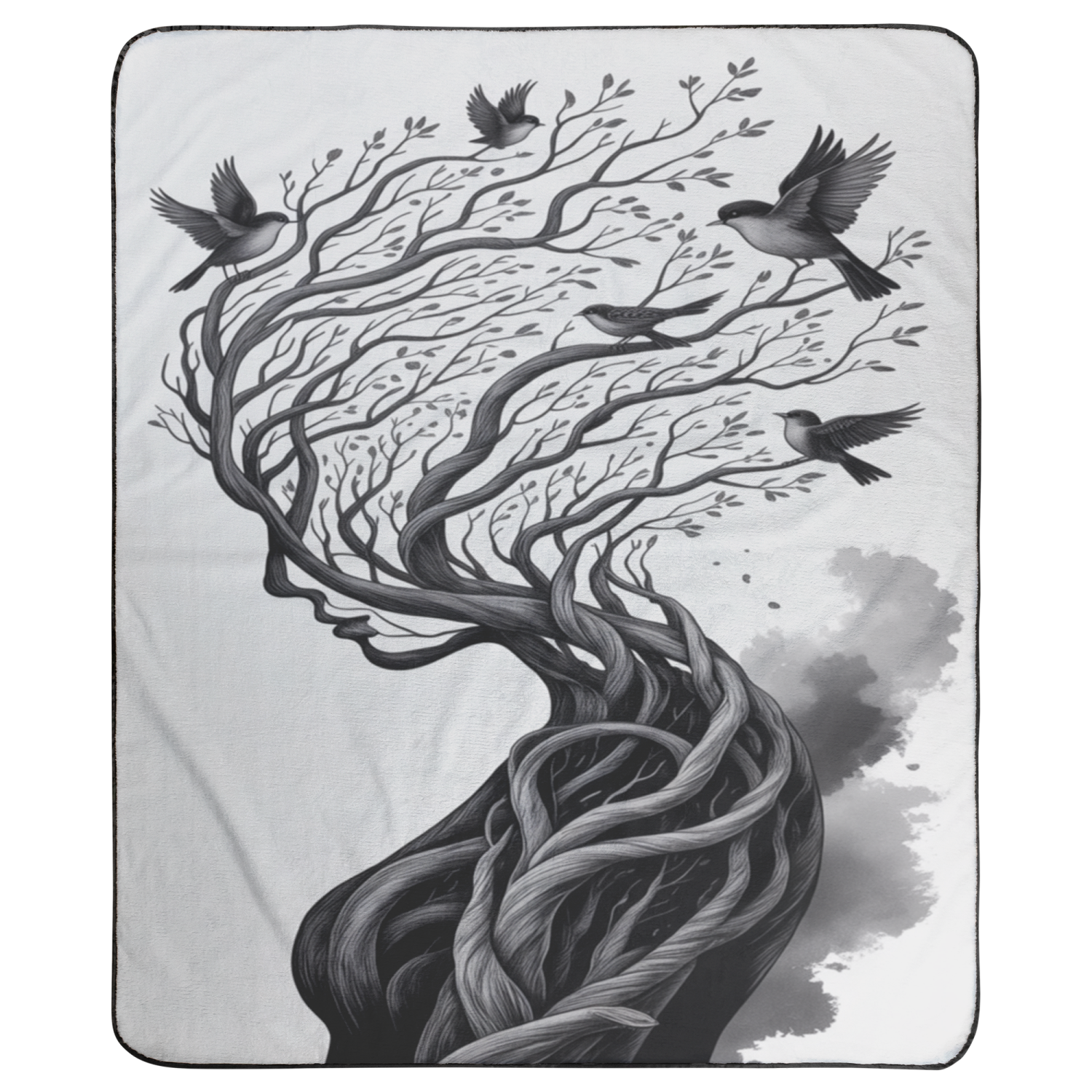 Wrap yourself in a touch of natural elegance with our enchanting stadium blanket. Featuring an intricate design of a woman seamlessly entwined with tree branches and fluttering birds, this piece brings a poetic sense of harmony, transformation, and quiet strength to your space. Crafted with super-soft fleece for cozy warmth and a tough, water-resistant bottom perfect for bleachers, picnics, and all your outdoor adventures, this blanket is your ultimate sidekick. It rolls up neatly with a handy carrying handle—no more blanket wrestling! Whether you’re curling up with a book or showcasing your love for artful design, this blanket is a stunning fusion of warmth, style, and storytelling wherever you go.