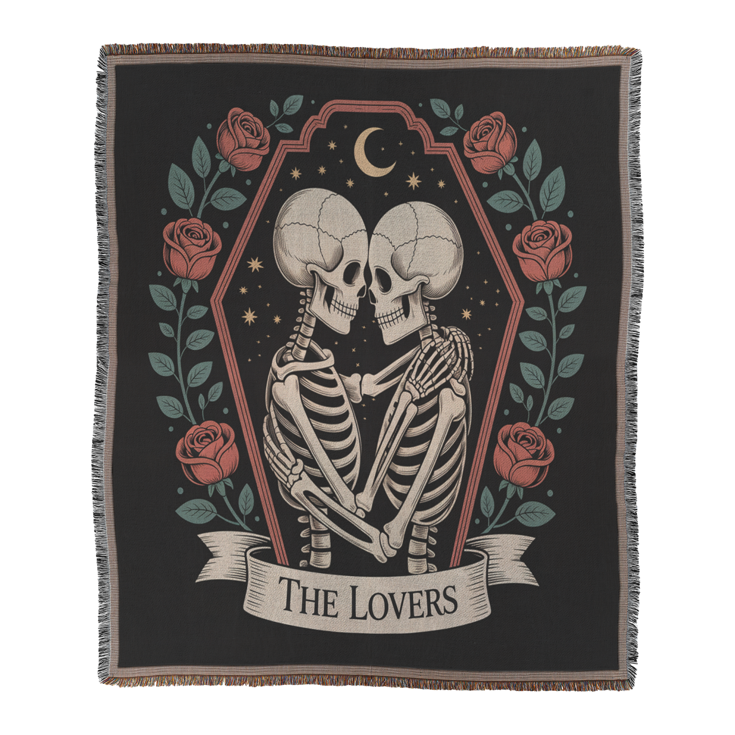 Fall head over heels—literally—with our hauntingly romantic “Lovers” woven throw blanket. Featuring two skeletons locked in a tender embrace, inspired by the classic Lovers tarot card, this design captures eternal love with a gothic twist.
